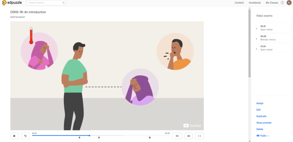 - The teacher introduces the main topic and what they are going to do by saying “Now, we will look more closely at Covid-19. I have a text for you. I am sure you will learn lots of things about it. However, before reading it, let’s watch a video related to it. Also, please watch it carefully because there are some questions in the video.”