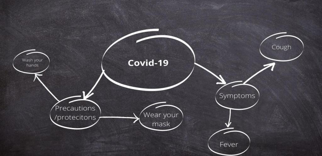 - the teacher draws a circle on the board and writes Covid-19 in the middle of it. Here the teacher aims to preview the vocabulary that is used in the text. The teacher says “I have drawn a circle on the board. I want you to tell me what comes to your mind when you see this word. I will be the first because in this way it will be easier to understand. Okay? Let’s get started. I want to start with symptoms because when I see the word Covid-19, this word usually comes to my mind. What about you? What comes to your mind related to symptoms? You can give examples if you want.” The teacher writes the word symptoms deliberately in order to present the vocabulary related to it such as cough, fever, shortness of breath, loss of smell and taste, etc. Then, the teacher writes precautions and follows the same procedure.